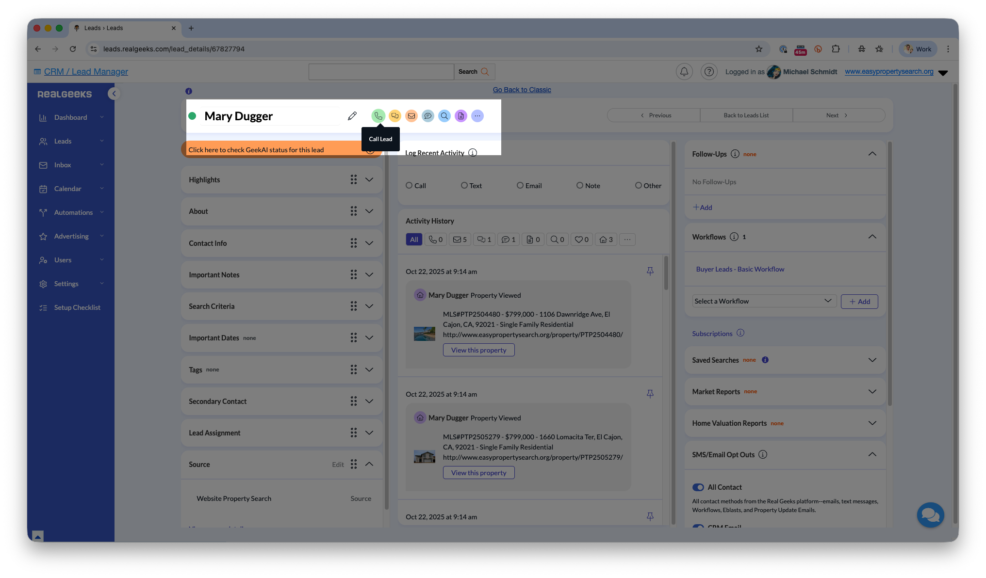 The Click to Call Dialer lets you place calls to your leads directly from your Real Geeks CRM. No phone juggling, no separate app, and no lost notes. You can talk to leads, record notes, and log call results in one place. This helps you stay organized, save time, and give every lead a consistent experience.