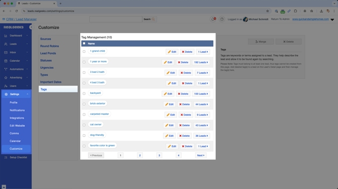 All users in the Lead Manager can view, edit, and delete tags. Changes made to tags will affect everyone using the system.