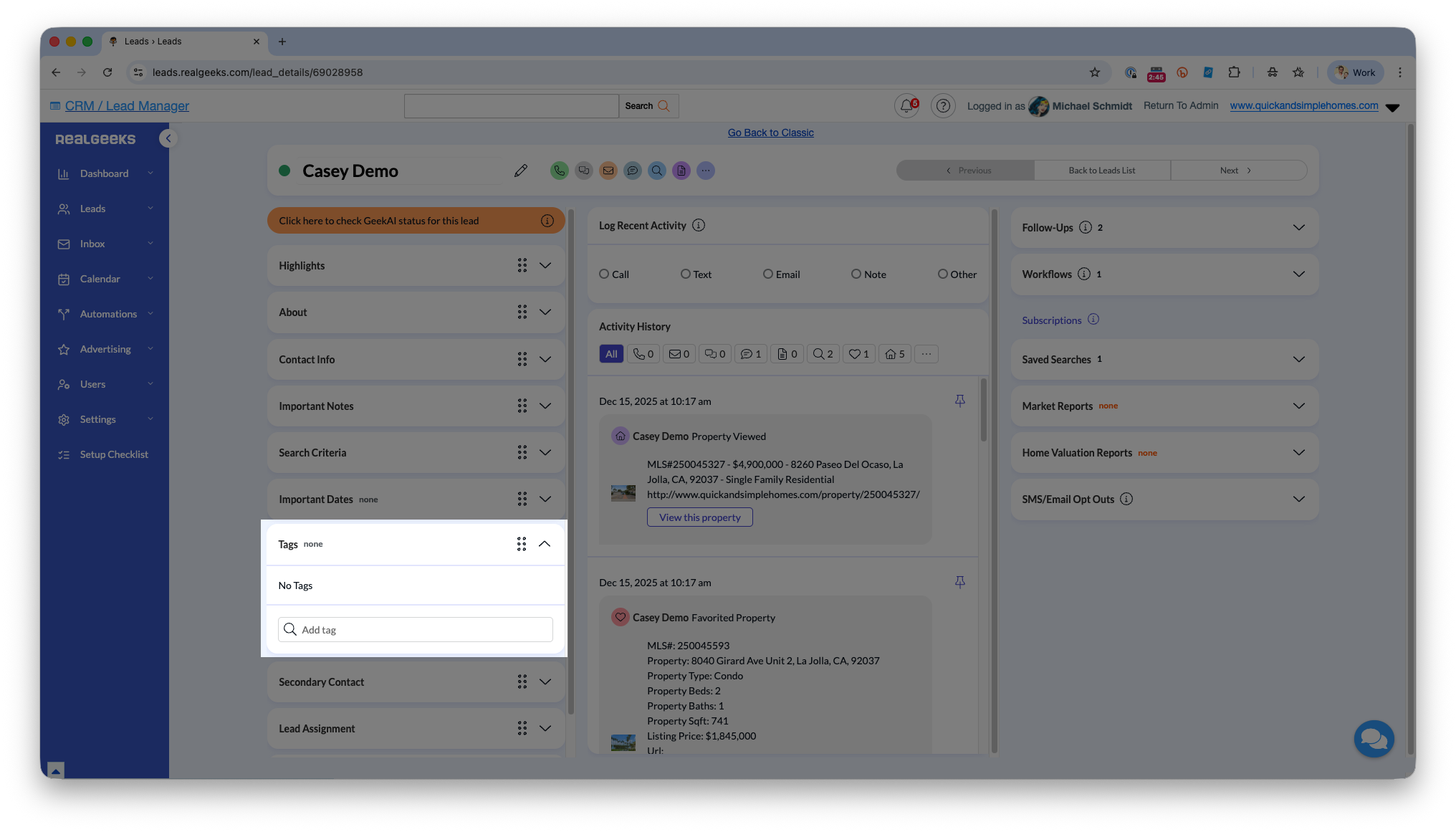 No. Real Geeks also lets you organize leads with menus like urgency, status, type, and timeframe. These standardized fields keep your pipeline structured, while tags offer flexibility for quick, custom labels that don’t quite fit into certain dropdown menus.