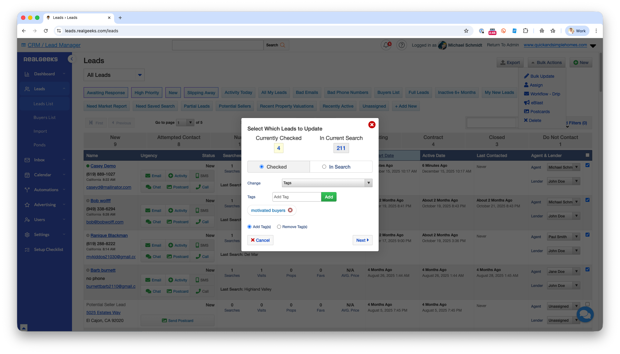 Bulk tagging lets you add or remove tags from many leads at the same time to save time.