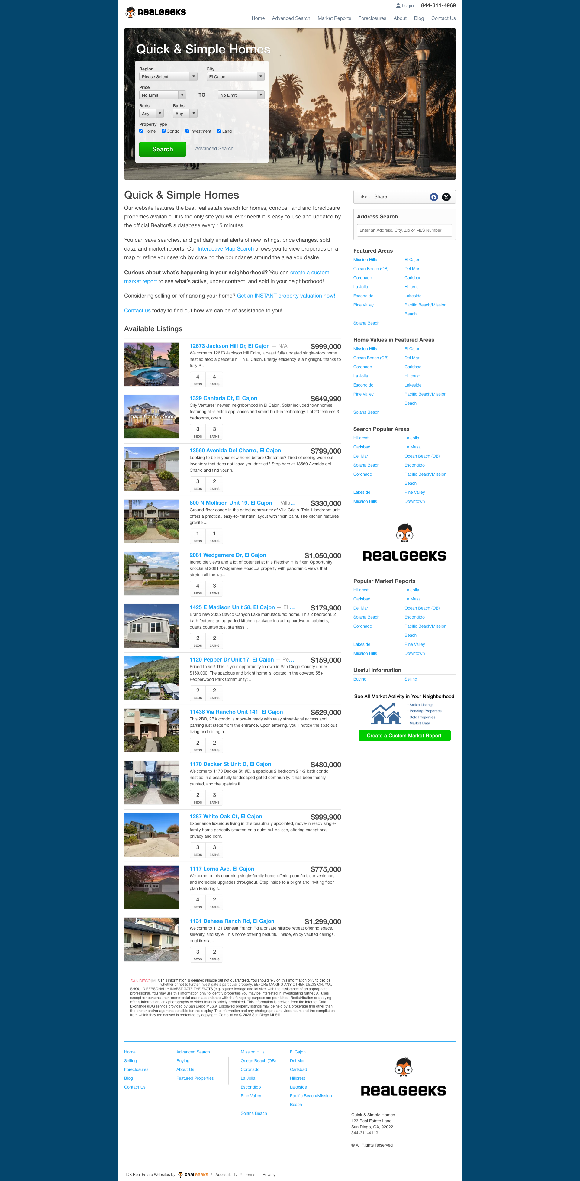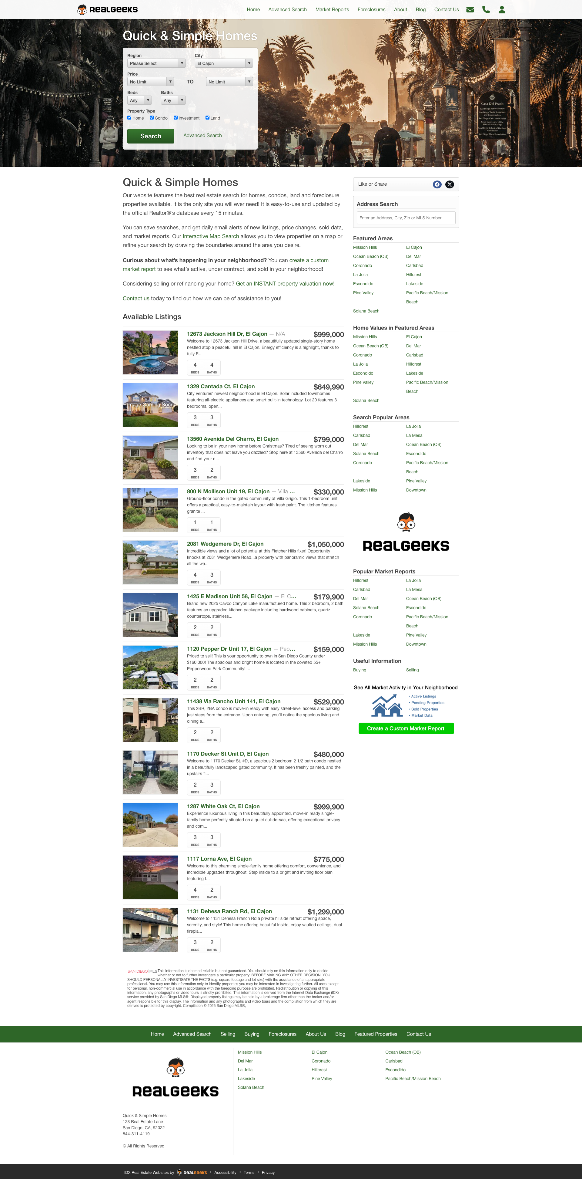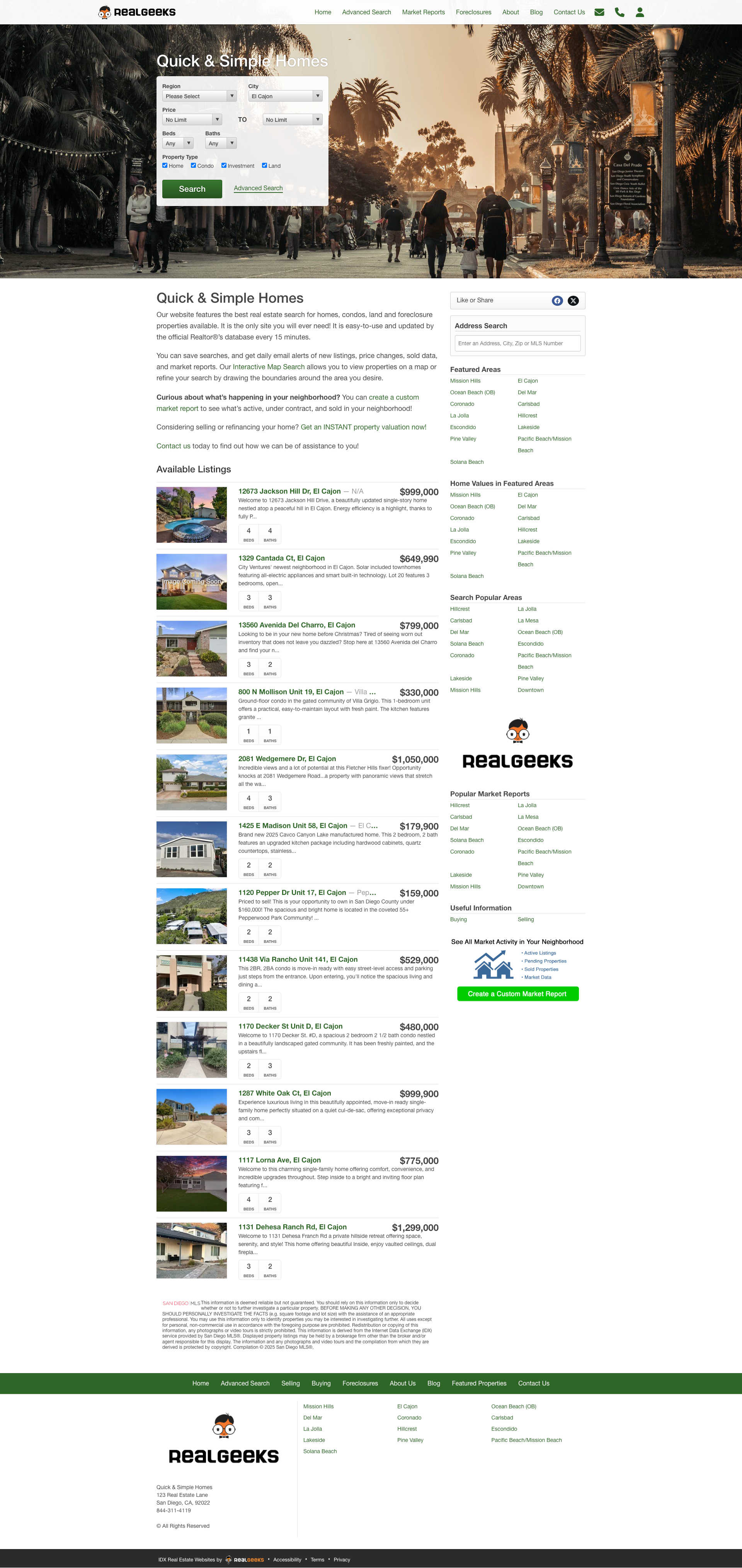 A balanced, content-friendly design with strong search placement and flexible sections. Perfect for highlighting market information, neighborhoods, and listing updates in a visually organized way.