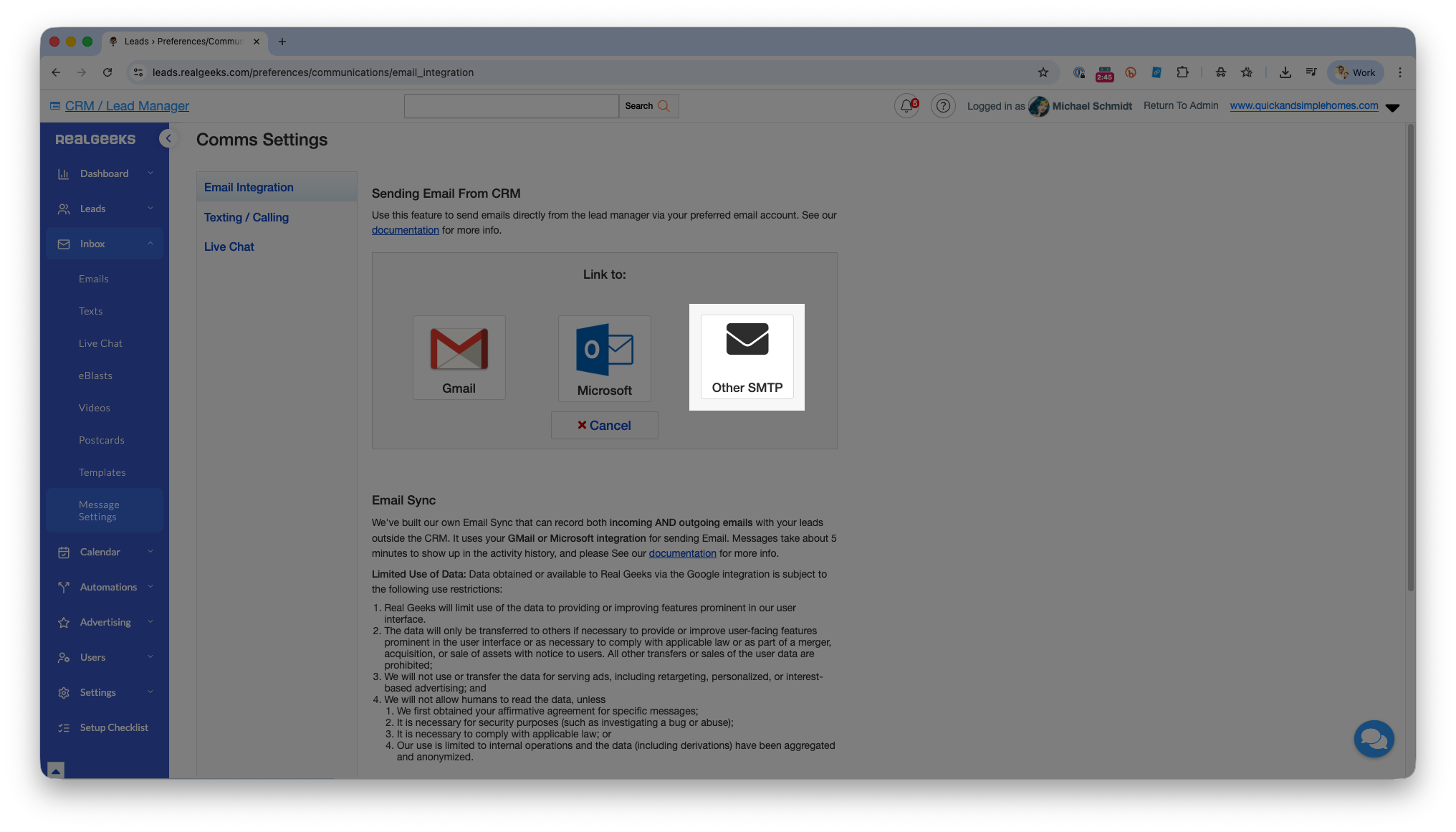 - You do not have to send all emails directly from Real Geeks. Integrating your email allows you to send emails from your personal inbox or phone, and those messages will still be saved on the correct lead profile in the CRM.