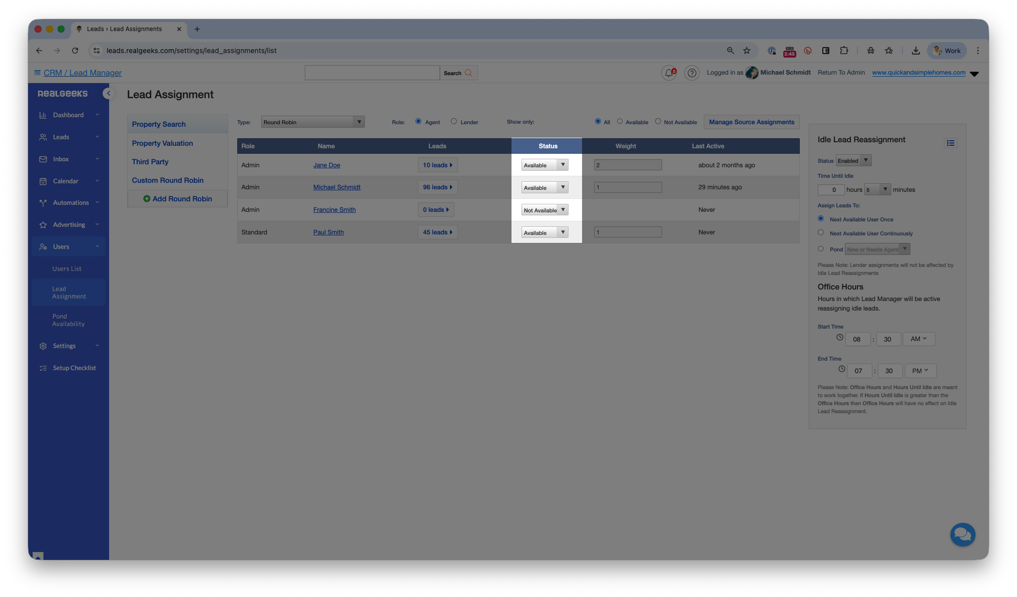 Their user status will be set to either Available or Not Available to receive leads. These can be adjusted at any time to fit your team’s needs.