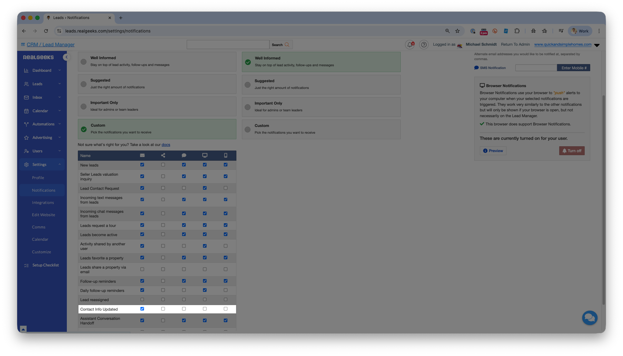 Enable the "Contact Info Updated" notification setting so you know when a lead's contact information is updated and you can contact them