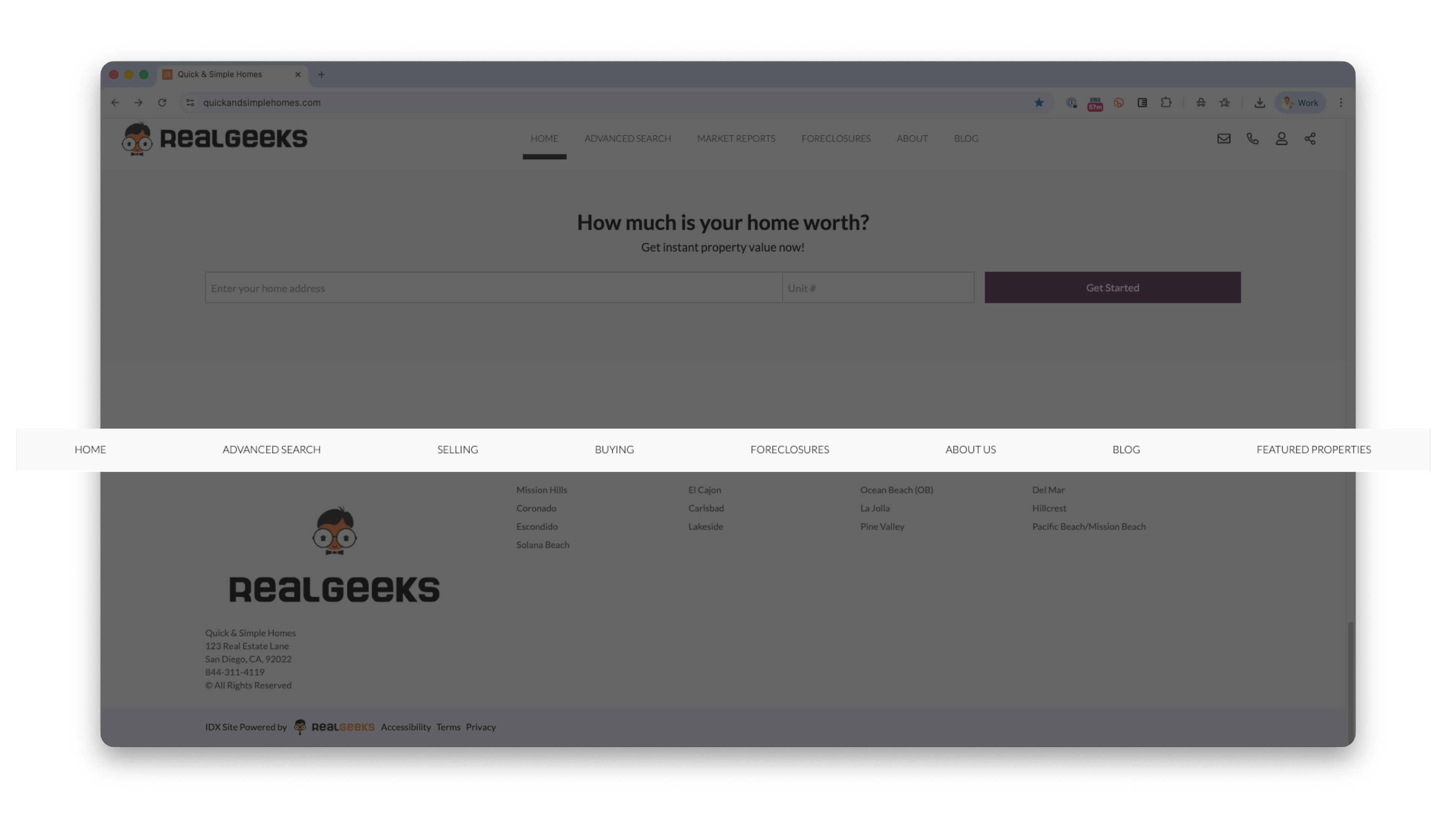 On a Real Geeks website, navigation menus appear in two main places: at the top of your website and at the bottom of your website. These areas help visitors move through your site quickly, whether they’re on desktop or mobile.