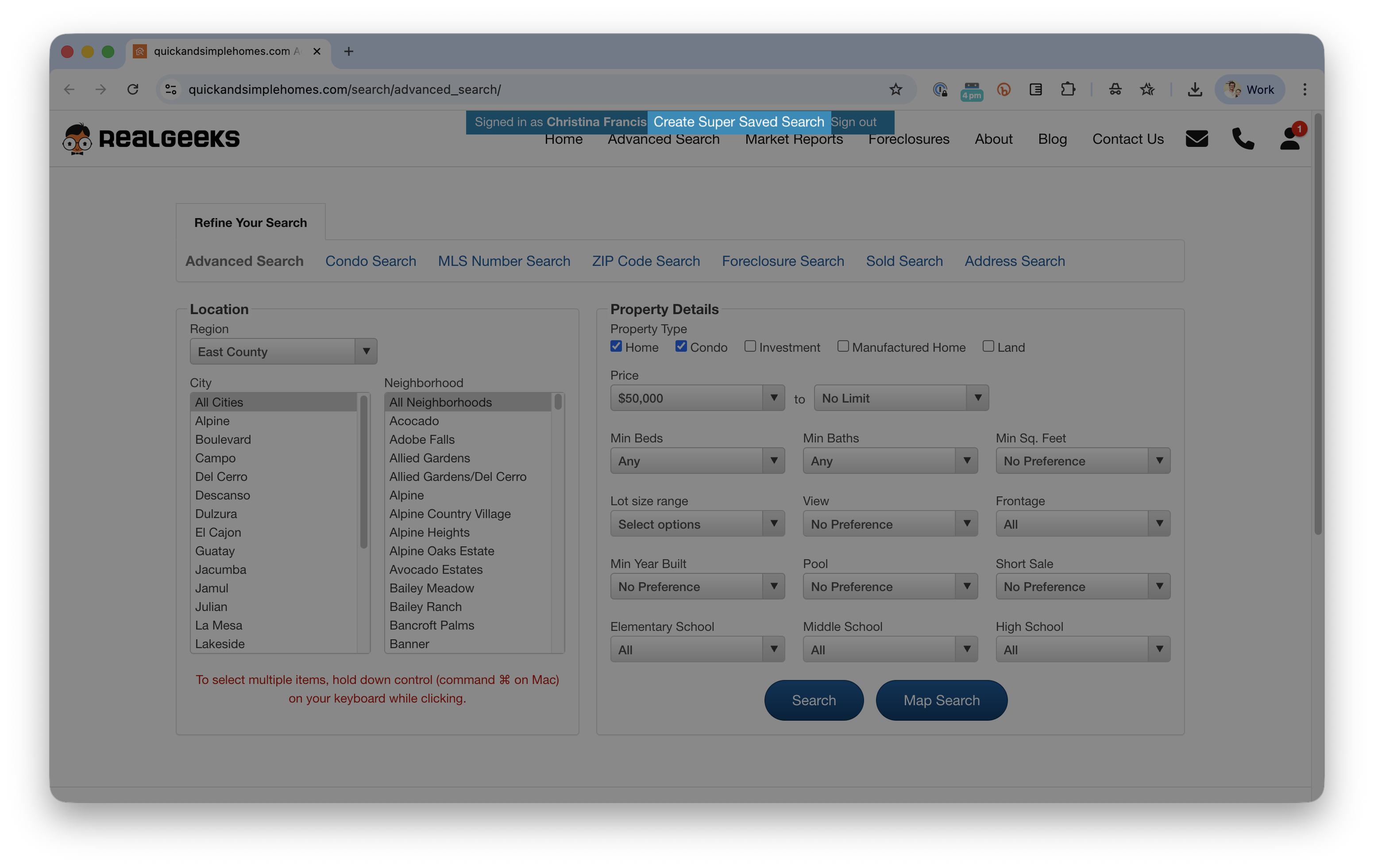 - Once you see the temporary login notice at the top of your website (confirming you are signed in as the lead), click Create Super Saved Search.