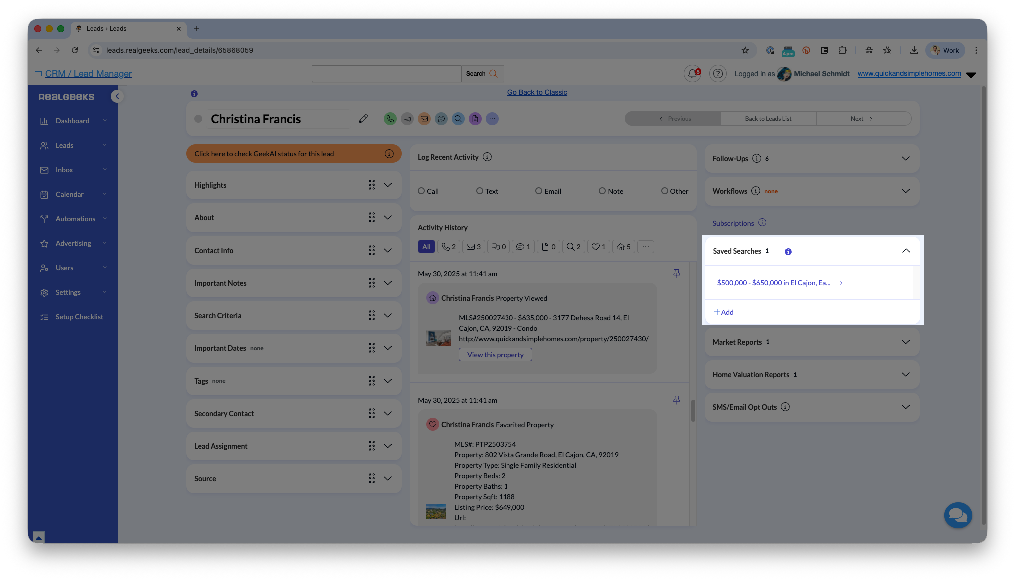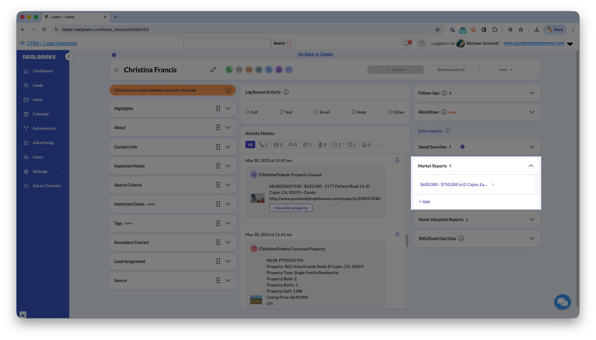 Real Geeks includes several automated email tools that help you stay connected with your leads without needing to manually send messages each time. These automations provide timely listing updates, market insights, valuation follow-ups, and activity‑based responses that keep your brand top of mind while supporting long‑term conversion.
